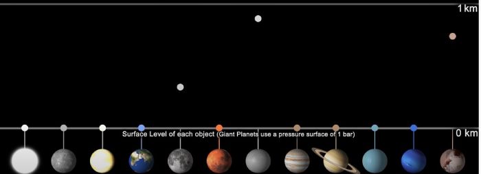Un corp lăsat să cadă către suprafața Soarelui are nevoie de 2,7 s să atingă astrul, dar lăsat să cadă spre Terra are nevoie de 14,3 secunde. Când atinge suprafața Soarelui, bila are o viteză de 2.663 kh/h, pe când în cazul Terrei viteza atinsă la atingerea solului este de doar 502 km/h. Gravitația Soarelui este enormă în comparație cu cea a Terrei. Probabil că nu te-ai gândit la asta, dar masa Soarelui reprezintă 99,8 % din masa întregului sistem solar! Mai multe lucruri interesante despre enormitatea Soarelui citește în articolul nostru: Sistemul solar la scară.