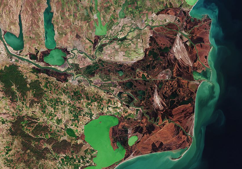 În imaginea de mai sus, în culori reale, obținută în aprilie 2020, vastele zone cu stuf pot fi văzute în nuanțe de maro, culoare tipică în această perioadă a anului. Zonele de verde deschis datorează culoarea probabil sedimentelor purtate de fluviu.