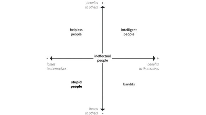 Pentru a vă scurta însă drumul spre concluzii, o să rezum lucrurile la faptul că Cipolla identifică două axe pe care ne plasăm ca ființe sociale: cea a beneficiilor personale și cea a beneficiilor sociale. După clasificarea asta, vorbim despre patru categorii de persoane: