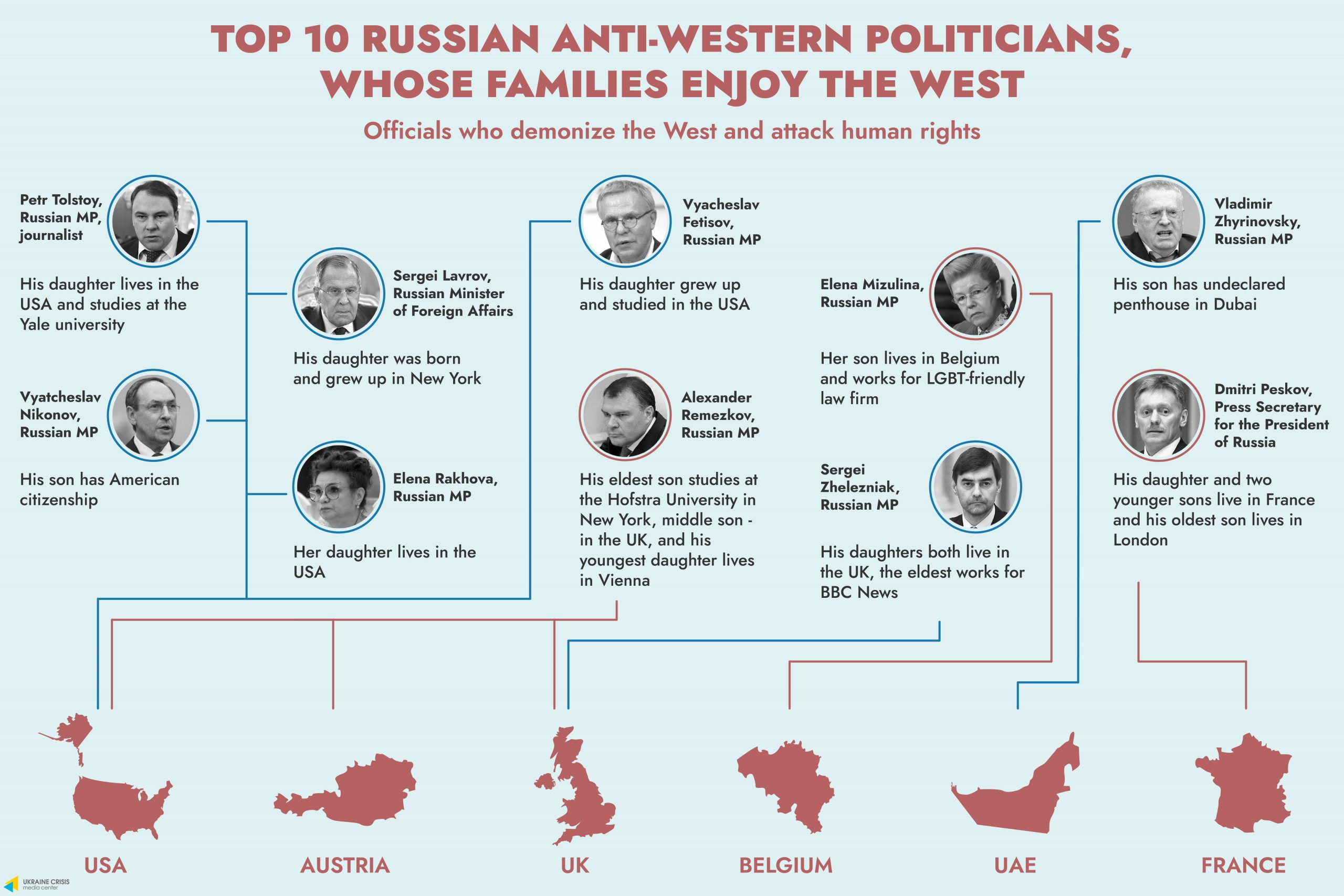 O să vedeți că în timp ce Putin și cercul său restrâns de colaboratori vorbesc zilnic poporului rus despre cât de rău este Occidentul, în fapt mulți au familiile în Occident, la studii ori trăindu-și viețile cu banii „cinstiți” obținuți în urma muncii grele prestate de „iluștrii” lor părinți / soți. Familiile politicienilor ruși trăiesc în vile de lux la Paris, frecventează facultăți de prestigiu americane și au iahturi de lux prin diverse porturi europene. Cu ura-n suflet, firește...