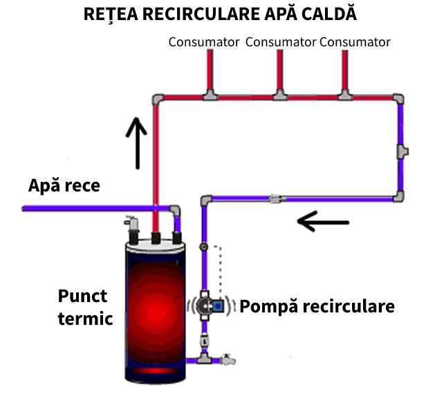 Dar nu ar trebui să existe cine știe ce consum pentru a avea apă caldă în câteva secunde de la deschiderea robinetului, pentru că există rețeaua de recirculare (a cărei configurație schematică o puteți vedea în imaginea de mai sus). Această rețea este, în fapt, un sistem de țevi care circulă continuu apa, într-un sistem închis.