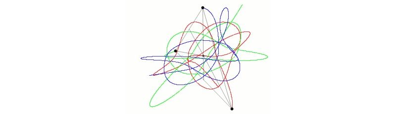Traiectoriile aproximative pentru trei corpuri de masă identică, care sunt plasate în vârfurile unui triunghi oarecare, toate trei având inițial viteza zero.