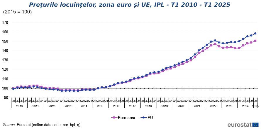 Conform datelor Eurostat, prețurile locuințelor au crescut cu 5,4% în zona euro și cu 5,7% în Uniunea Europeană în primul trimestru al anului 2025, comparativ cu același trimestru din 2024.