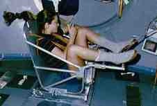 Astronauta Tamara Jernigan cântărindu-se la bordul Staţiei Spaţie. Este legată de un scaun ataşat de un resort, precum masa din figura f. (NASA)