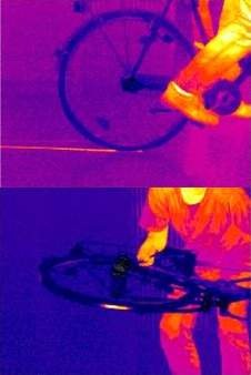 Obiectele aflate la temperaturi mai scăzute vor emite de asemenea lumină, dar în partea de infraroşu a spectrului, adică partea curcubeului aflată după culoarea roşie, imperceptibilă omului. Fotografiile din figura w au fost surprinse cu un aparat cu infraroşu. Biciclistul a apăsat brusc pe frâna din spate şi s-a oprit prin alunecare. Energia cinetică a bicicletei şi a corpului său sunt transformate rapid în căldură prin frecarea dintre roată şi sol. În prima parte, puteţi vedea lumina porţiunii încălzite a solului, iar în cea de a doua, pe cea a roţii.