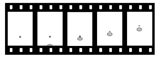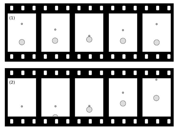 q / O coliziune inegală, văzută în sistemul centrului de masă, 1, şi în sistemul în care mingea mică este iniţial în repaus, 2. Mişcarea este prezentată ca şi cum ar apărea pe filmul unei camere de filmat vechi, având un timp egal de separare între cadre. Filmul 1 a fost realizat de o cameră care a urmărit centrul de masă, iar filmul 2 de una care iniţial a urmărit mingea mică şi a continuat să se mişte cu aceeaşi viteză după coliziune.