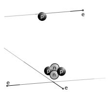 d/ Modelul unui atom: hidrogen (primul) şi heliu (al doilea). La această mărime, orbitele electronilor ar fi de mărimea unui campus universitar.