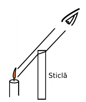Lumina de la o flacără întâlneşte o bucată de sticlă şi îşi schimbă direcţia de deplasare. Prin introducerea sticlei se ajunge la schimbarea poziţiei aparente a flăcării.