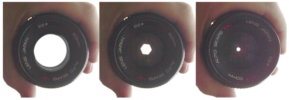 Aparatul de fotografiat funcționează după un mecanism similar. În imaginea de mai sus diametrul celei mai mari deschideri (aperturi) este de 10 ori mai mare decât apertura cea mai mică. Dar făcând un cerc de zece ori mai mare înseamnă să mărești suprafața deschiderii de 100 de ori (nu de zece ori, cum s-ar putea crede).