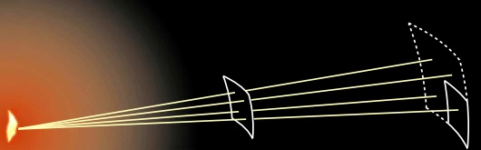 Imaginea de mai sus arată ce se întâmplă dacă dublezi distanța sursei. Lumina se răspândește în toate direcțiile. Alegem 4 raze dintre cele care trec prin primul păstrat. Doar una trece și prin pătratul de aceeași arie aflat la o distanță dublă. Dacă cele două pătrate ar fi ochii unei persoane, atunci doar o pătrime din lumină primită de prima persoană ar ajunge la cea de-a doua, aflată la mai mare distanță.