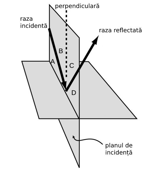 Reflexia speculară (care nu este difuză) urmează două reguli geometrice simple: a) unghiul razei reflectat este același cu unghiul razei incidente; b) raza reflectată este situată în planul (plan de incidență) care conține raza incidentă și perpendiculara (vezi imaginea de mai sus).