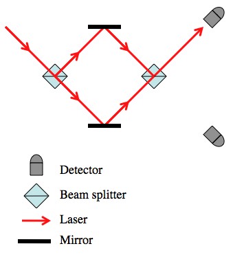 Să considerăm cazul similar al unei raze laser care trece printr-un separator de fascicule şi să adăugăm mai multe elemente constructive aparatului. Cu ajutorul câtorva oglinzi puteţi reuni din nou cele două fascicule către un alt separator de fascicule. Undele luminoase de pe ambele căi se separă din nou la cel de-al doilea separator de fascicule, dar atunci când verificaţi intensitatea luminii ce iese din acesta trebuie să ţineţi cont de modul cum interferă undele luminoase de pe cele două direcţii.