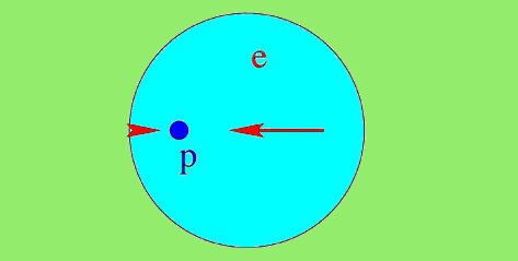 Funcţia de undă a electronului, reprezentată de cercul albastru, nu se poate afla strict doar de o parte a protonului.