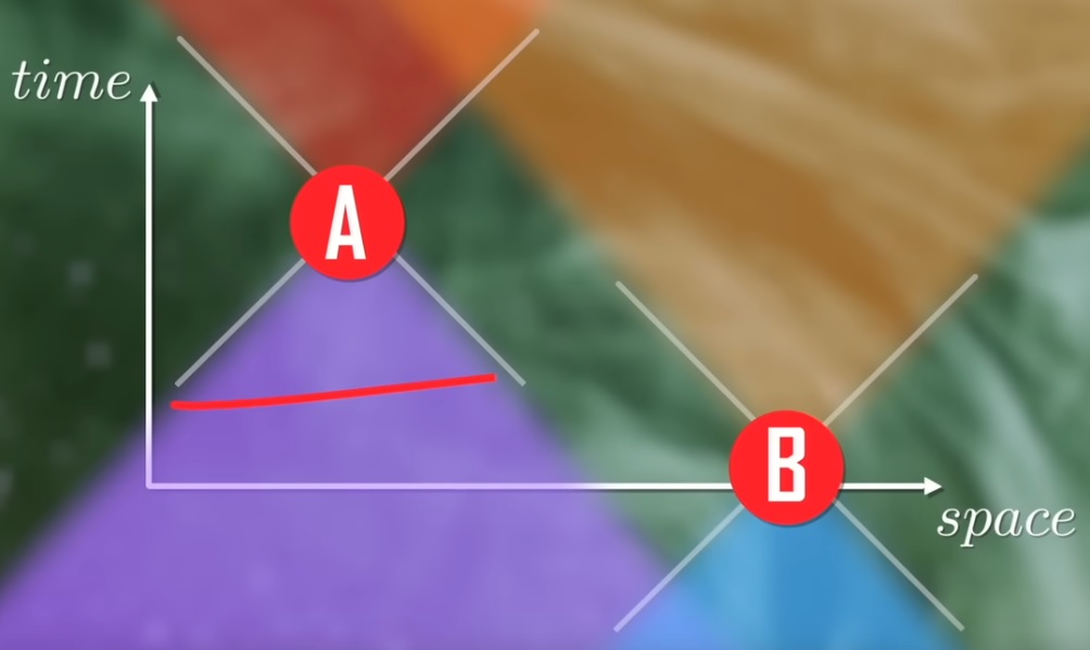 Potrivit lui Einstein, nimic nu poate depăși viteza luminii în vid. Aceasta înseamnă că, dacă are loc un eveniment, atunci orice poate fi influențat de acest eveniment trebuie să se afle în regiunea delimitată de linii de 45 de grade care ies din eveniment. Această limită se numește „viitorul con de lumină”, iar regiunea care poate fi influențată de eveniment este cea din interiorul acestuia. De asemenea, există o regiune care conține tot ceea ce poate influența evenimentul, care este interiorul conului de lumină din trecut.