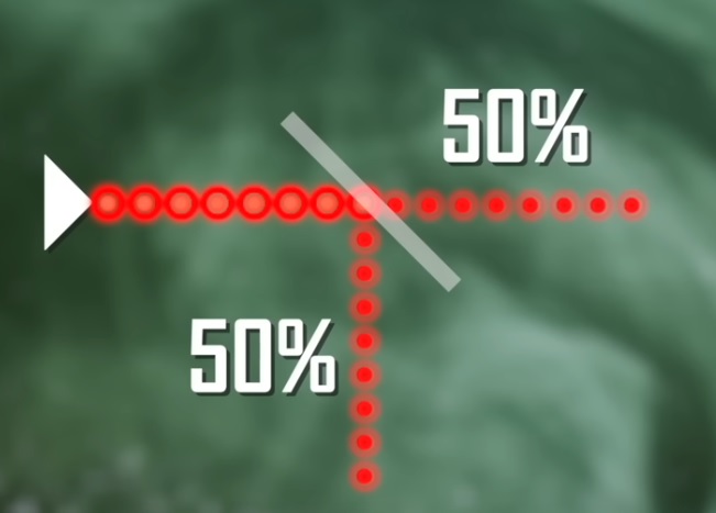 Imaginați-vă, de exemplu, că aveți un singur foton, pe care-l trimiteți printr-o placă semi-transparentă. Ilustrația de mai sus arată doar două dimensiuni ale spațiului, gândiți-vă la blatul mesei. Fotonul are o probabilitate de 50% să treacă prin placă și o probabilitate de 50% să fie reflectat. Atâta timp cât nu observăm fotonul, funcția sa de undă se schimbă local, de la un loc la altul prin răspândirea în aceste două direcții. Dar odată ce facem o măsurătoare, știm unde a mers fotonul. Apoi, probabilitatea sare la 100% pe partea în care ați măsurat-o și scade la zero la sută pe cealaltă parte. Este ca atunci când Alice își deschide plicul și vede +1.
