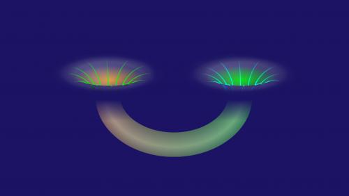 Imaginea prezintă o gaură de vierme ce conectează două găuri negre.