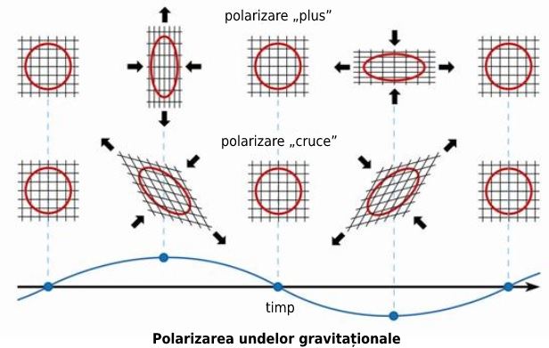 Dacă lumina are două tipuri de polarizare: în sensul acelor de ceasornic și în sensul invers, undele gravitaționale au o polarizare denumită „plus, +” și una denumită „cruce, x”, cu direcțiile de compresie-și-extindere aflate la 45° una de alta.