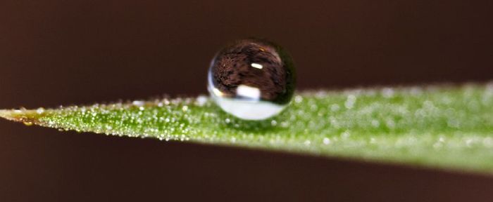Cum apa nu aderă la suprafața frunzei, picătura păstrează o formă aproape sferică, deformată puțin de gravitație.