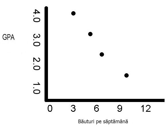 Aceasta este o corelaţie negativă, adică atunci când o variabilă creşte, cealaltă scade. Pe măsură ce cantitatea de alcool consumată creşte în grafic, punctajul GPA corespunzător scade. (Într-o corelaţie pozitivă, variabilele cresc sau scad împreună, iar graficul este o pantă ascendentă.)