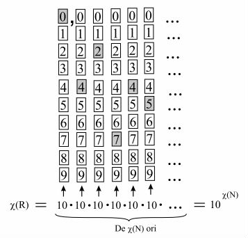 Figura 1: Câte numere reale avem? Pentru fiecare cifră a numărului real avem zece alegeri. În figură este exemplificat numărul real 0, 42745…. Numărul total χ(R) de numere reale este un produs al acestor posibilităţi χ(R) = 10⋅10⋅…⋅10⋅…. Dacă notăm cu χ(N) numărul infinit de elemente al mulţimii numerelor naturale, atunci avem χ(R) = 10χ(N). Interesant este că cele două numere χ(N) şi χ(R) sunt infinităţi diferite, pentru că nu poate fi găsită o relaţie bijectivă între mulţimile pe care le reprezintă.