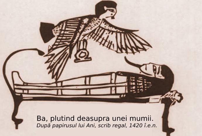 • Pentru vechii egipteni, în corp existau trei entități: ka, ba (vezi imaginea de mai sus) și akh. Ka era un fel de dublură a omului și un spirit protector, care supraviețuia morții, într-o pictură ori o statuie; era reprezentat prin două brațe îndreptate în sus în poziție de protecție. Ba era ceva apropiat de ceea înțelegem azi prin „suflet” și era reprezentat printr-o pasăre cu cap de om. Akh era spiritul celui decedat. Greu de înțeles cu precizie aceste concepte, cum nu s-au găsit materiale scrise care să le explice foarte bine.