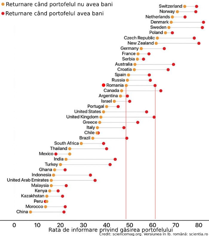 Rezultatele cercetării au fost publicate joi în revista Science. Procentul de returnare a portofelelor, pe ţări, poate fi văzut în imaginea de mai jos.
