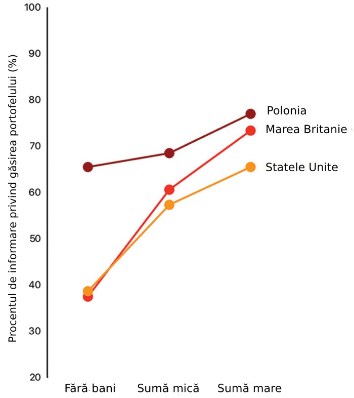 În medie, portofelele cu bani au fost "returnate" proprietarilor în 51% din cazuri, iar cele fără bani doar în 40%.