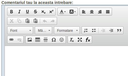 Iată în imaginea de mai jos cum ar trebui să se afișeze editorul, incluzând printre butoanele cele mai de jos, în capătul din dreapta, și butonul editorului matematic (e posibil, desigur, ca afișarea să difere de la browser la browser ori de la un calculator la altul):