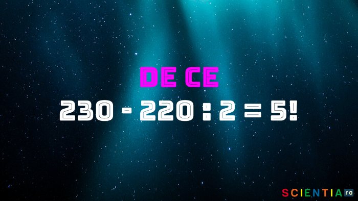 Rezultatul din titlul acestui articol este, fără îndoială, corect! Nu e nimic necurat la mijloc. Iată de ce calculul este corect. Desigur, prima operaţie pe care trebuie s-o efectuăm este împărţirea: 220:2=110. Ulterior efectuăm scăderea: 230-110=120. Dacă efectuăm întâi scăderea (230-220=10) şi apoi împărţirea (10:2), obţinem 5, dar ordinea operaţiilor este greşită. Şi, totuşi, am spus că e corect: 230 - 220 : 2 = 5! Şi încă susţinem asta! Care-i misterul?