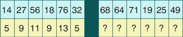 Ce set de numere din cele șase de mai jos ar trebui să înlocuiască semnele de întrebare? Care este relația dintre setul de sus și cel de jos?