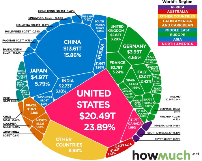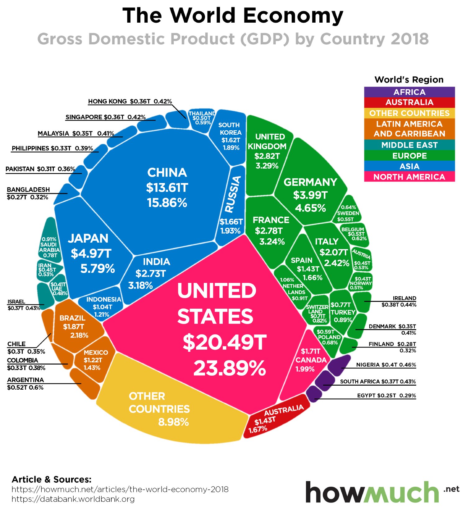 PIB-ul întregii planete a crescut cu 6,9% în 2018, de la 80,2 trilioane de dolari în 2017 la 85,8 trilioane de dolari. Aproape jumătate din această creștere a venit de la cele mai mari două economii ale lumii: Statele Unite, cu 20,5 trilioane de dolari (cu 5,4% mai mare față de 2017) și China, cu 13,6 trilioane de dolari (în creștere cu 10%). Nu, România nu este în acest grafic.