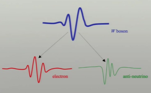 Spuneam că aceste câmpuri interacţionează unul cu altul. Ca urmare, un câmp aflat în oscilaţie poate afecta alte câmpuri. Aşadar, oscilaţia câmpului bosonului W (pe care o numim „bosonul W") se transferă către celelalte câmpuri, în cazul nostru către câmpul electronului şi câmpul anti-neutrinului, generând oscilaţii ale acestor câmpuri; oscilaţii care, aşa cum am afirmat mai sus, sunt identificate ca particule prin măsurători.