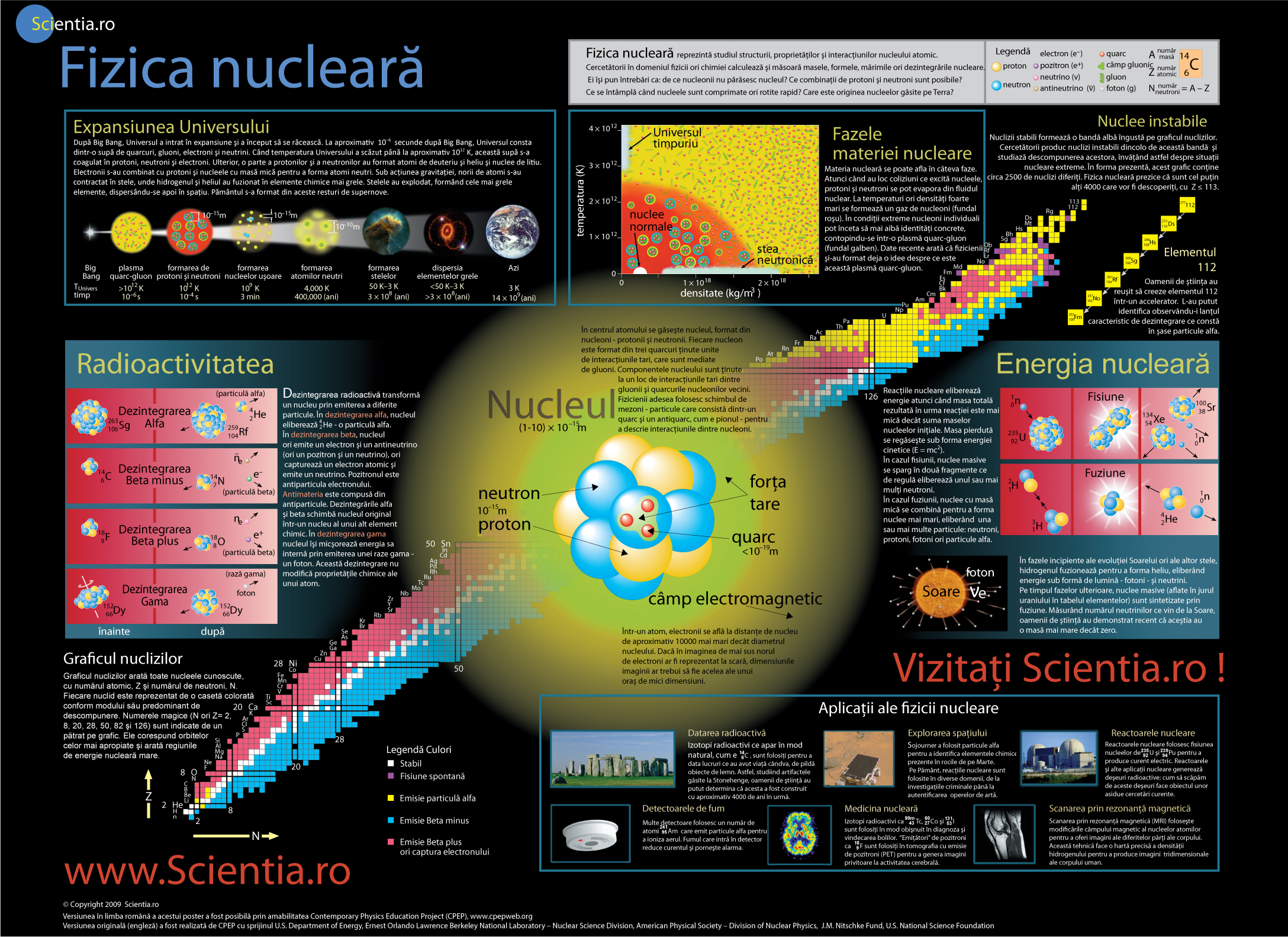 Scientia.ro vă oferă un al doilea poster realizat în condiţii grafice de excepţie conţinând o sinteză a teoriilor fizicii nucleare. Astfel, veţi putea citi despre diferitele tipuri de dezintegrări (alfa, beta şi gama) ce survin la nivelul nucleului atomic. De asemenea, puteţi afla care sunt aplicaţiile fizicii nucleare, ca, de pildă, scanarea prin rezonanţă magnetică.
