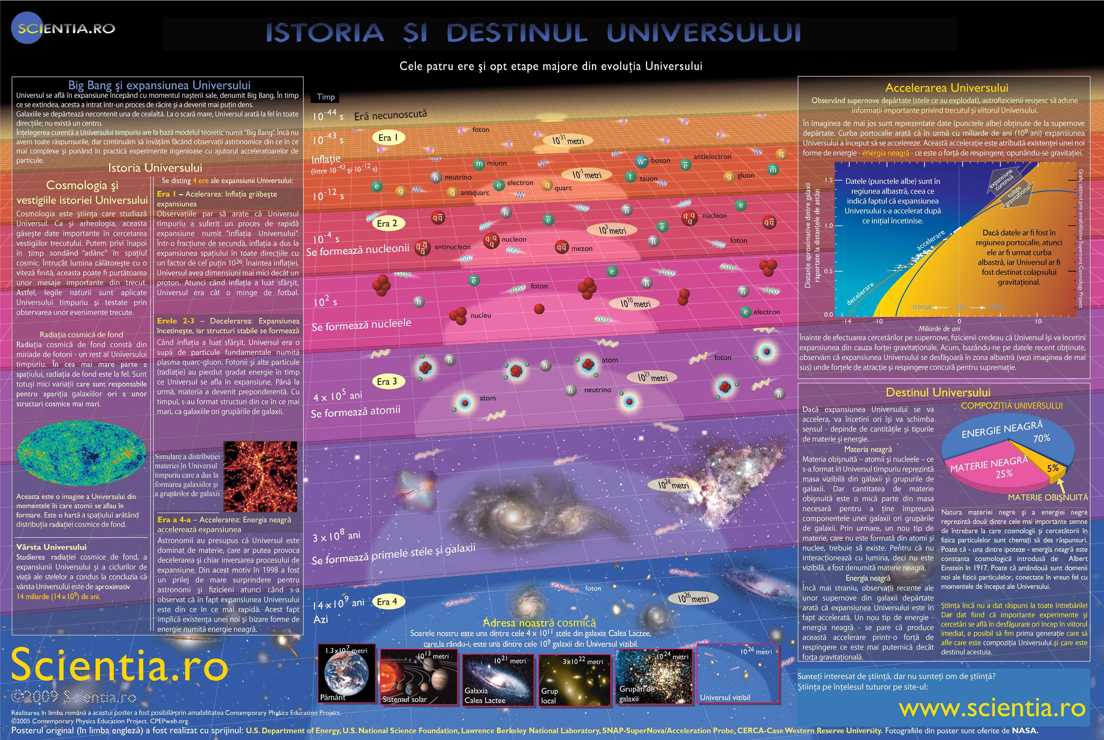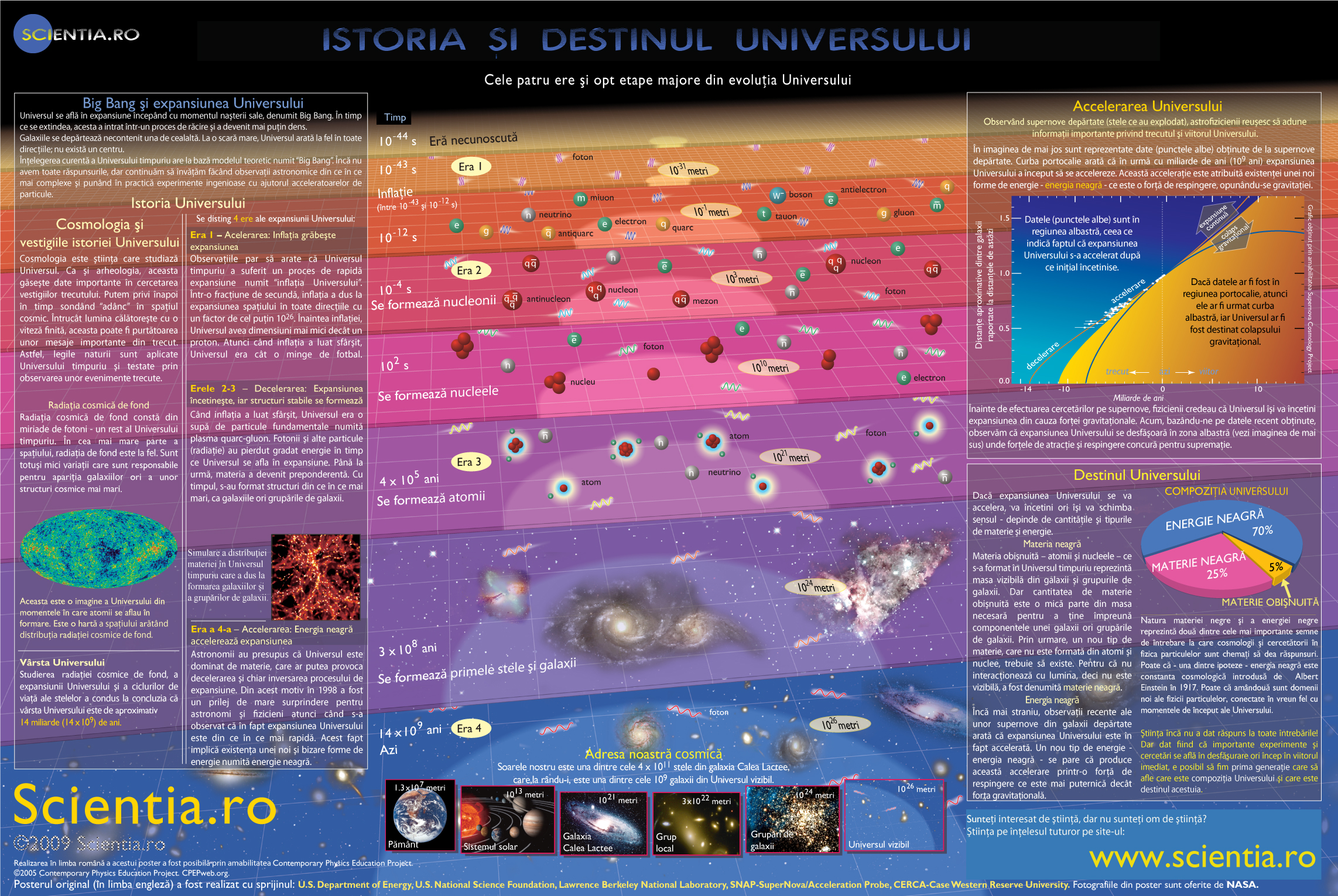 Scientia.ro vă oferă un al treilea poster realizat în condiţii grafice deosebite dedicat istoriei şi destinului Universului. Vă veţi putea familiariza cu teoriile moderne privitoare la naşterea Universului, veţi afla de ce fizicienii afirmă că materia neagră şi energia neagră trebuie să existe, dacă Universul îşi încetineşte expansiunea etc.