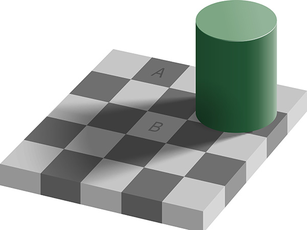 Priviți, așadar, pătratele A și B de pe tabla din imaginea de mai sus. Pătratele par a fi în mod clar diferite; pătratul A are, în mod evident, o nuanță mai închisă de gri decât pătratul B. Dar este doar o iluzie...
