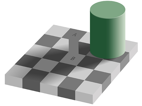 Ce se întâmplă? De ce vedem lucrurile astfel? Pentru că sistemul vizual nu este doar un simplu „contabil”, care consemnează diverse intensități ale luminii de diverse culori, ci ia în calcul complexitatea lumii înconjurătoare, cu multiple surse de lumină și multiple umbre - și încearcă să ne ofere cea mai bună estimare a celor la care ne uităm. Iar în imaginea noastră vedem cum un cilindru verde aruncă o umbră pe tabla cu pătrate, schimbând, așadar, imaginea „pură”, fără interferențe, adică o tablă care ar fi sub aceeași sursă de lumină, care ar fi distribuită uniform. De acest joc de lumini și umbre sistemul vizual trebuie să țină cont, și o face, cu prețul acestei interpretări cumva bizare a două pătrate care au aceeași culoare, dar ne par a fi diferite.