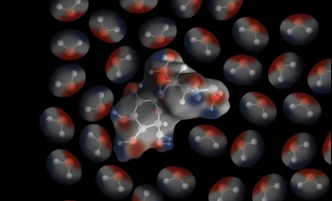 În imagine, în centru, vedeți molecule de sucroză, care sunt separate ca urmare a reacției cu moleculele de apă din jur.