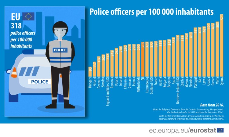 Uniunea Europeană avea 1,6 milioane de polițiști în 2016. Dacă Ungaria are 90 de polițiști la 100 mii de oameni, Cipru are 573.