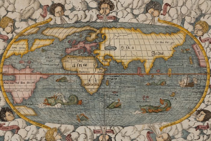 Harta lumii, realizată de geograful german Sebastian Münster şi publicată în 1574.