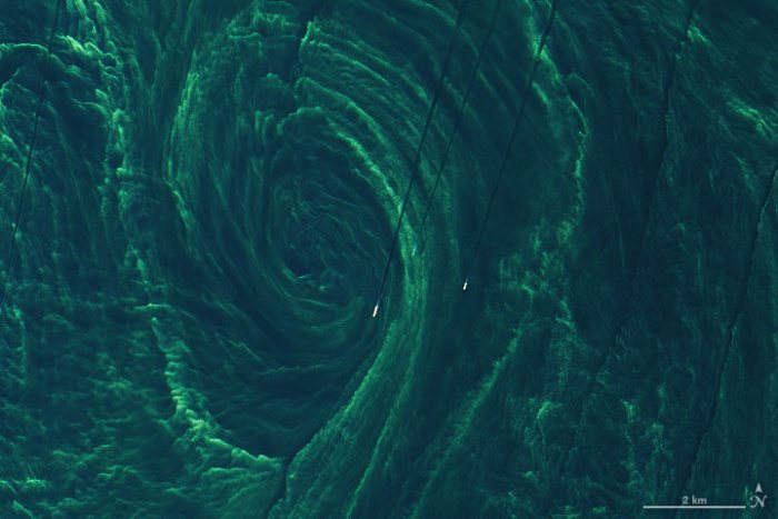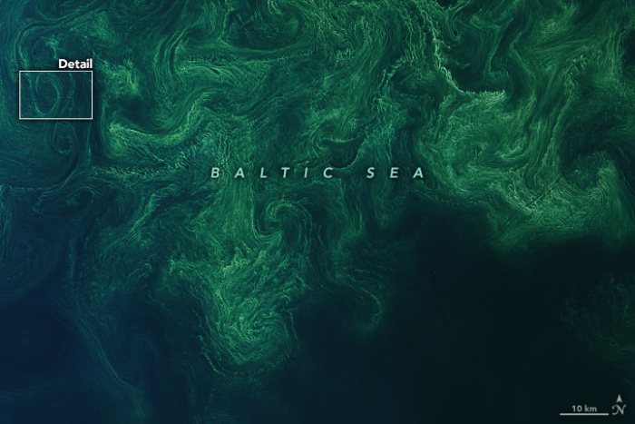 • Largi colonii de alge albastre-verzi apar în fiecare an Marea Baltică, oferind un spectacol vizual deosebit oricărui fotograf aflat... la mare înălțime. În fapt, deși sunt numite „alge”, nu sunt alge, ci... bacterii. Culoarea o datorează unui pigment albastru numit ficocianină, care, împreună cu clorofila, dau nuanța albastră-verzuie. Pigmenții sunt împrăștiați haotic în citoplasmă. (link ‹eng›)