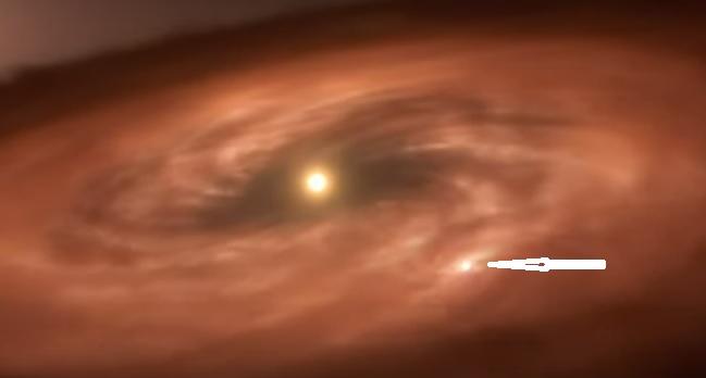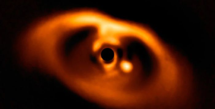În imagine vedeți o planetă în formare (pata luminoasă din partea dreaptă). Zona neagră centrală „ascunde” astrul sistemului solar și este rezultatul blocării artificiale a luminii stelei.