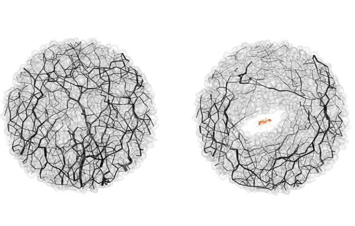 Înainte ca furnicile să sape tunelurile, forțele din sol sunt aliniate aleator (stânga), după, acestea se aliniază în jurul tunelului