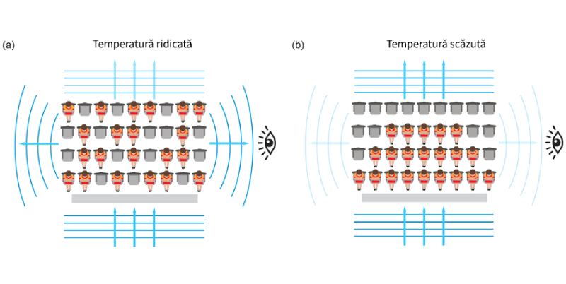 Principiul excluziunii (detalii, mai jos) poate fi ilustrat printr-o analogie implicând oameni ocupând locuri într-o sală de cinema. Fiecare persoană reprezintă un atom, iar fiecare scaun o stare cuantică. La temperaturi ridicate (a), atomii sunt distribuiți aleator, așa că aceștia pot reflecta lumina. La temperaturi scăzute (b), atomii stau strâns grupați, doar cei cu mai mult spațiu, de la marginile grupării de atomi, putând reflecta lumina.