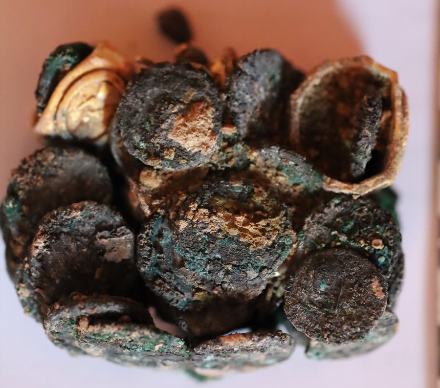 Monedele și podoabele erau într-o cutie de lemn, dar incendiul prin care a trecut casa le-a afectat, după cum se poate observa în imaginea de mai sus.