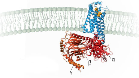 Ilustraţie a structurii cristaline Kobilka a unui receptor β-adrenergic activ (reprezentat cu albastru). Un hormon (reprezentat cu portocaliu) se ataşează la exterior şi o proteină (reprezentată cu roşu) se cuplează la interior.