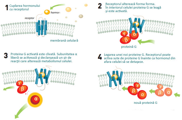 Atunci când un hormon, moleculă olfactivă sau moleculă gustativă se cuplează cu un receptor de pe suprafaţa celulară, se declanşează un lanţ de reacţii în interiorul celulei.