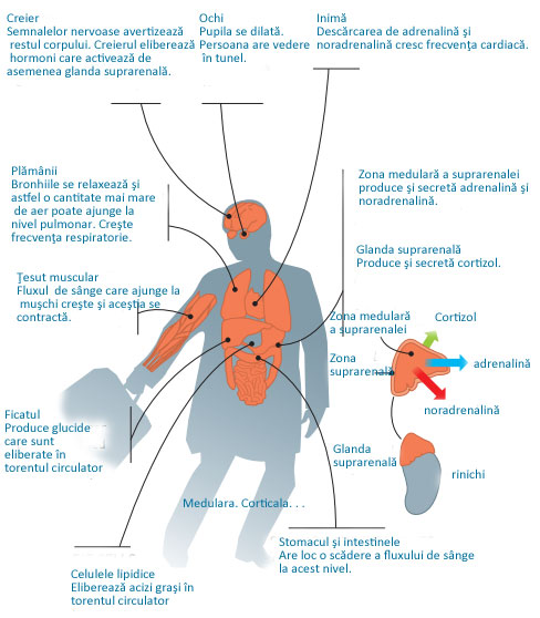 În momentul în care ochiul tău a înregistrat silueta care se apropie, întregul tău corp a încremenit. Semnale nervoase provenite de la nivelul creierului au trimis corpului un prim avertisment. Glanda pituitară a eliberat hormoni în circulație care stimulează glandele suprarenale. Aceasta a început să pompeze cortizol, adrenalină şi noradrenalină care au emis un nou semnal de alarmă: este timpul să o iei la fugă! Celulele adipoase, celulele musculare, ficatul, inima, plămânii şi vasele de sânge au reacţionat imediat. Sângele a fost inundat de zahăr şi grăsime, bronhiile s-au dilatat şi frecvenţa cardiacă a început să crească, toate pentru ca muşchii dumneavoastră să poată să obţină mai multă energie şi mai mult oxigen. Scopul este să vă facă să alergaţi cât de repede puteţi pentru a vă salva viaţa.