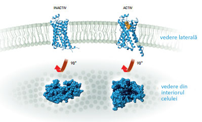 β-receptorul adrenergic îşi modifică forma atunci când este activat. Pe măsură ce hormonul (reprezentat cu portocaliu) se ataşează la exterior, interiorul se deschide ca un buchet de flori. În imaginile din partea de jos, receptorul este activat, astfel încât partea dinspre interior este vizibilă. Atomii sunt reprezentaţi sub formă de bile. Porţiunile solubile în apă sunt redate cu albastru deschis. Părţile lipidice (hidrofobe) sunt reprezentate cu albastru închis. Atunci când se leagă hormonul (imaginea din dreapta), se deschide un canal hidrofob unde se ataşează o subunitate α a proteinei G.