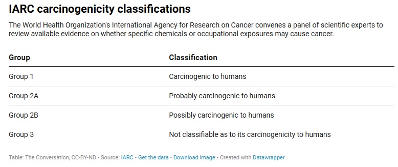 During its 50-year history, the IARC has evaluated and classified over 1,000 chemicals and other hazards. Many of these classifications have had broad societal implications, such as those for tobacco smoke, ambient air pollution, diesel engine exhaust and processed meat. All were classified as Group 1, or confirmed to be carcinogenic to humans. Electromagnetic radiation emitted by mobile phones was classified as Group 2B, or possibly carcinogenic, and red meat was classified as Group 2A, or probably carcinogenic. Though they haven’t directly led to any regulations, these classifications have motivated additional scientific studies. While the IARC can advise regulators, it’s up to countries to implement policies.