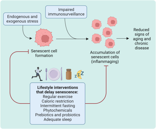 Fig. 2. Lifestyle interventions to delay senescence. The formation and accumulation of senescent cells can be reduced by various lifestyle interventions that can improve health and longevity, mainly by reducing inflammation.